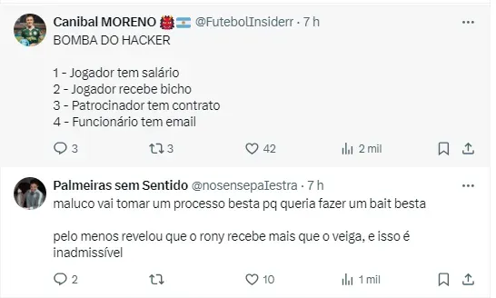 “O Palmeiras tomou conhecimento da conduta criminosa de um usuário da rede social X divulgando o que aparentam ser informações confidenciais de colaboradores e parceiros comerciais”, iniciou a nota.