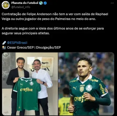 A informação da ESPN é que a diretora não quer negociar Raphael Veiga, mesmo com mais uma peça chegando para reforçar o elenco de Abel Ferreira no meio do ano.