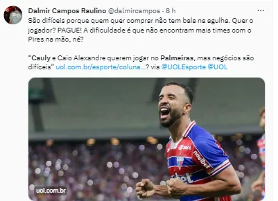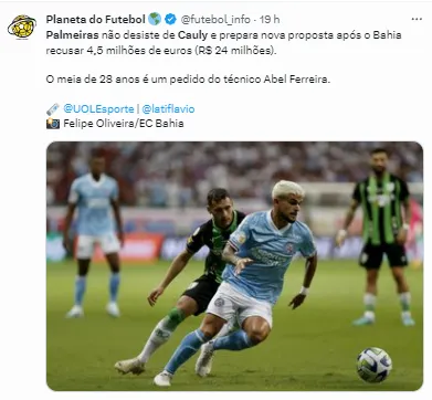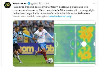 O Bahia não quer perder um atleta que foi referência do elenco, mas o Palmeiras colocou esse nome em uma situação que parece ter agradado um pouco mais os dirigentes do clube baiano”, destacou o comunicador.