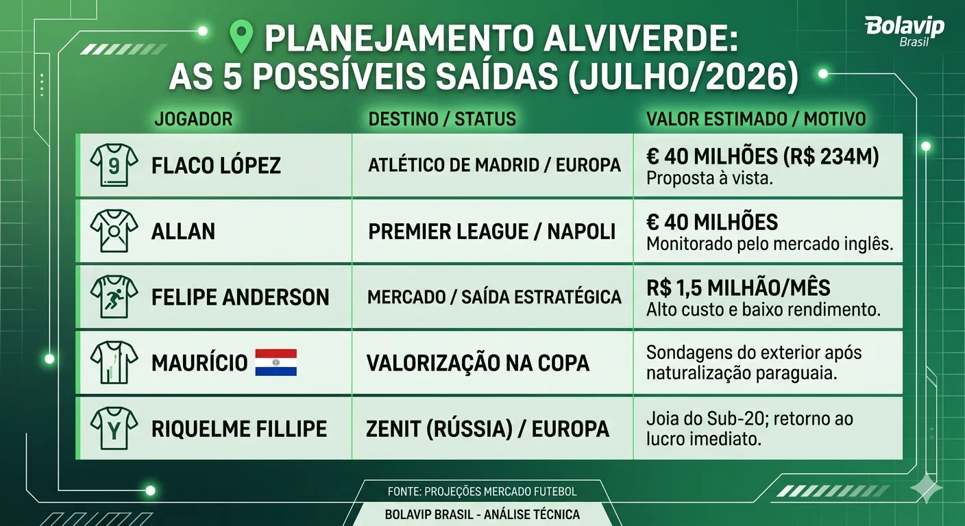Além do centroavante argentino, o Alviverde não descarta as vendas dos meias Allan Elias, Felipe Anderson e do jovem Riquelme Fillipi, de acordo com a ESPN. O futuro do trio está indefinido.