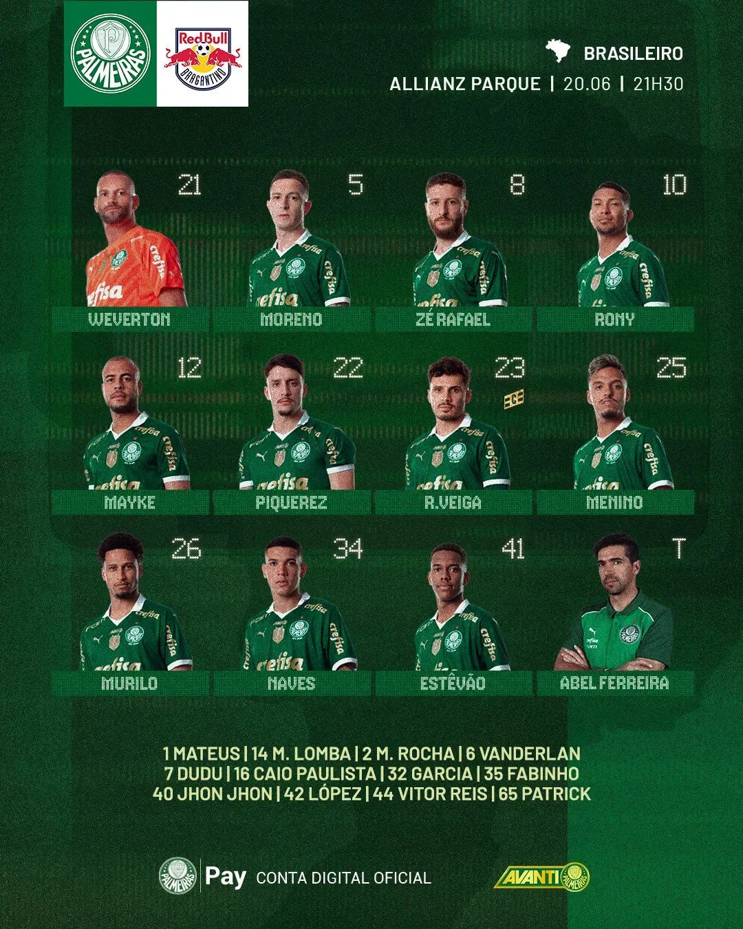Com Weverton no gol, a defesa é composta por Mayke, Murilo, Naves e Piquerez. Já no meio-campo, o Verdão vem com Aníbal Moreno, Zé Rafael, Gabriel Menino e Raphael Veiga. No ataque, estão Rony e Estêvão!
