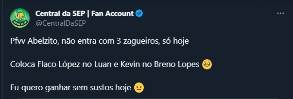 Dito isso, por mais que o Alviverde da Pompeia tenha vencido sete dos últimos nove jogos que fez no Brasileirão, o torcedor resolveu fazer um pedido para o português: modificar a escalação diante do Flu.