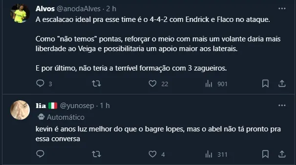 Assim, nas redes sociais, inúmeros palmeirenses resolveram pedir Kevin, Flaco López e o esquema com dois defensores. No entanto, a tendência é que Abel mantenha o mesmo time.
