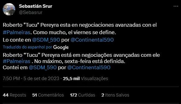 Além do mais, o jornalista deu um prazo para a situação ser resolvida. No máximo até sexta-feira desta semana, mais precisamente no dia oito de setembro. Pereyra está livre no mercado depois que deixou a Udinese, da Itália, portanto chegaria sem custos ao Palmeiras.