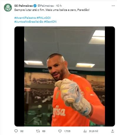 “Eu acho que, não só o Breno, mas todos os jogadores têm muito respeito pela torcida. A gente tem uma parceria incrível aqui dentro da nossa casa, em qualquer lugar que a gente vai jogar o torcedor está presente. Temos o respeito e sabemos o quanto eles são importantes pra gente (…) o Breno comemorou, desabafou ali, mas a gente jamais pode falar de desrespeito, porque o torcedor sabe o quanto a gente se entrega. No final tudo é por eles. É para dar alegria ao torcedor. Hoje foi um grande gol do Breno que nos deu os 3 pontos, e a gente está feliz por isso”, disse o goleiro palmeirense.