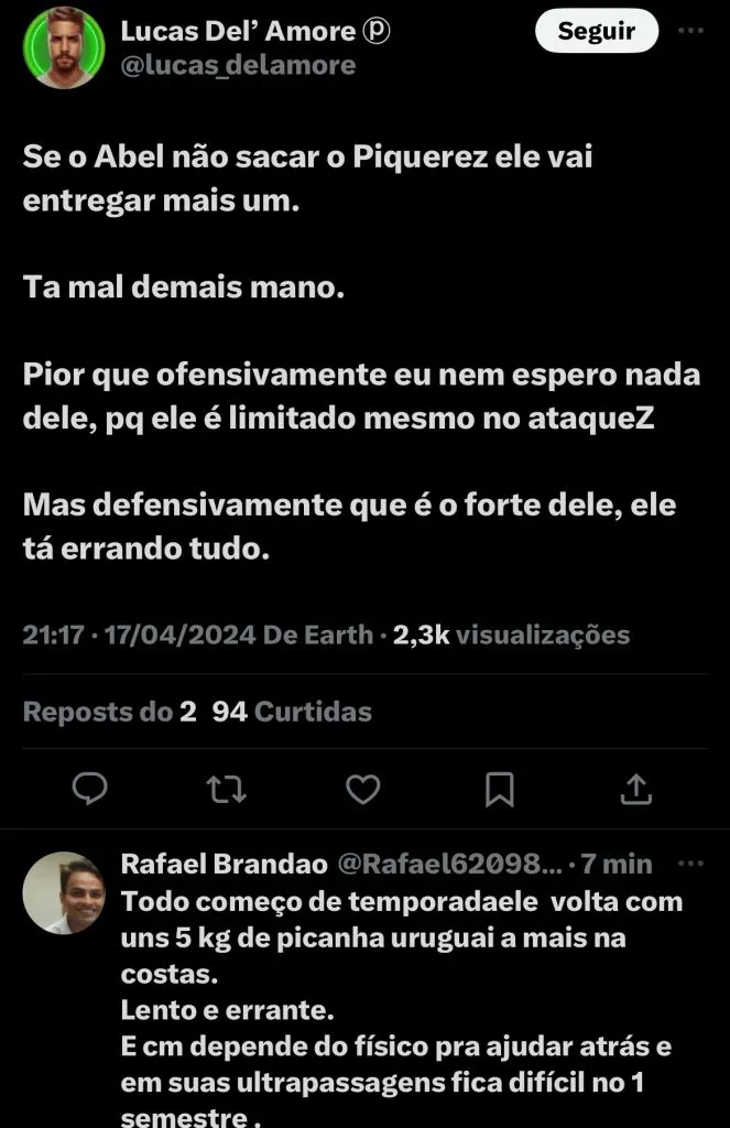 “Põe a bola pra fora, Piquerez. O que é melhor? Um lateral ou um gol? A burrice do jogador de futebol é algo bizarro”, questionou um terceiro. “Piquerez já tinha dado umas duas vaciladas. Dessa vez, custou o gol. Defesa do Palmeiras batendo MUITA cabeça nesse primeiro tempo”, reclamou outro.