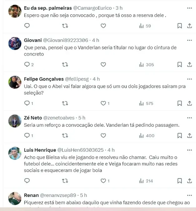 Conforme apurado pelo portal Nosso Palestra, o técnico uruguaio divulgou uma com diversos nomes. No entanto, o treinador não deixou claro quem deverá ou não ser convocado.