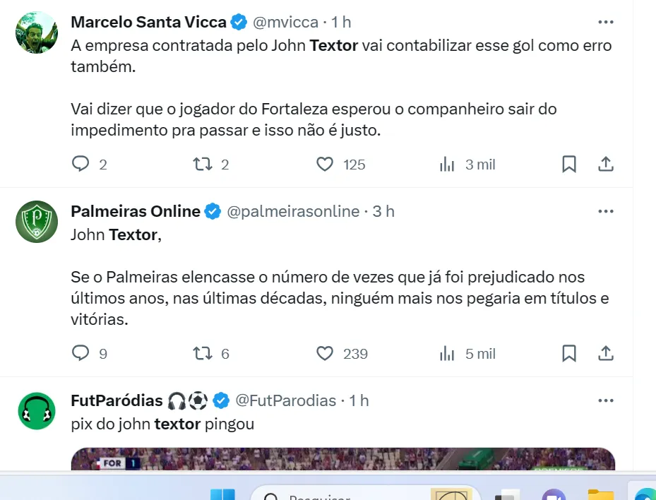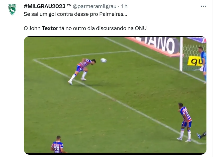 Nas redes sociais, torcedores e setoristas do Palmeiras ironizaram o lance. “Se sai um gol contra desse pro Palmeiras, Textor está no outro dia discursando na ONU”, debochou uma página humorística. “Textor e a turma do Fogão iam falar que o campeonato está comprado”, completou o jornalista Gabriel Amorim, do Lance!. “Textor fez o PIX, reclama agora”, ironizou outro fã alviverde.