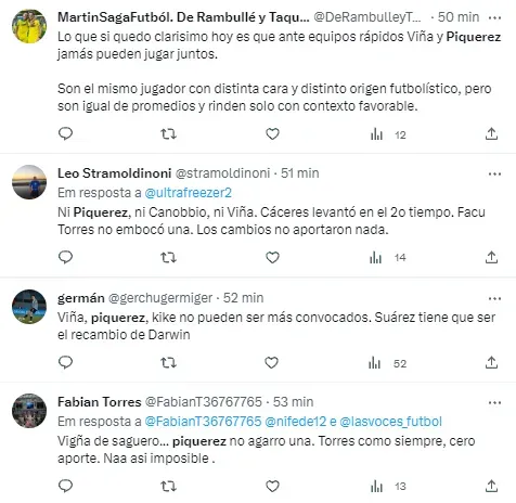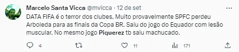 Se na vitória do time celeste o defensor do Verdão foi um dos grandes destaques, com direito a passe estiloso para Pellistri, desta vez Piquerez levou a culpa pela derrota. O 1 a 0 sofrido para o Equador ficou marcado por uma atuação abaixo da média do lateral-esquerdo. A torcida uruguaia chegou a comentar nas redes sociais que o desempenho dele foi “preguiçoso” e que ele não deveria ser convocado novamente. Ainda por cima, o jogador também sentiu dores.