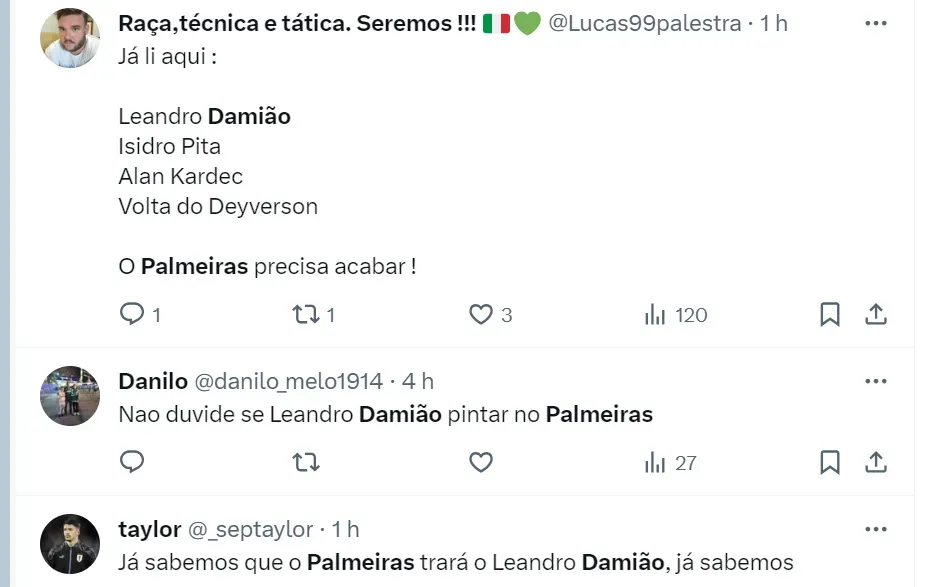 O setorista Diego Firmino, que cobre o dia a dia do Palmeiras, informou sobre Leandro Damião. O centroavante de 34 anos está livre após deixar o Kawasaki Frontale, do Japão, e foi também indicado a Abel e alta cúpula na rua Palestra Itália.