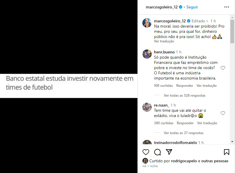 “Na moral, isso deveria ser proibido! Pro meu, pro seu, pra qual for, dinheiro público não é pra isso! Só acho!”, postou Marcos por meio de sua conta oficial no Instagram. O goleiro costuma criticar o uso do dinheiro público em patrocínios de clube de esporte.
