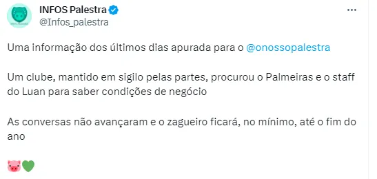 Em meio a isso, uma situação acabou vindo à tona. Isso porque de acordo com o Nosso Palestra, um jogador do Alviverde Paulista acabou sendo procurado para deixar a equipe. Trata-se do zagueiro Luan, que foi titular na vitória contra os goianos. A equipe em questão, que foi mantida em sigilo, quis saber as condições de um eventual negócio.