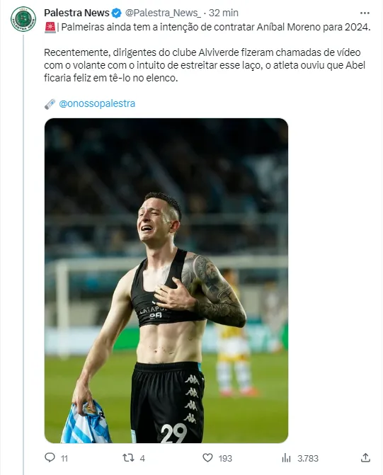 De acordo com a fonte do site, dirigentes do Palestra fizeram ligações de vídeo com Aníbal Moreno e o volante descobriu a intenção de Abel Ferreira em trabalhar com ele no Brasil. O argentino viria para atuar na posição antes ocupada por Danilo, que defende agora o Nottingham Forest, da Premier League. A definição completa deve vir na virada do ano, mas essa corre na frente como a mais provável primeira contratação do Clube para 2024.