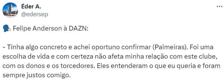 “Não acompanho notícias de mercado, mas neste momento tinha algo concreto e achei oportuno confirmar (…) Foi uma escolha de vida e com certeza não afeta minha relação com este clube, com os donos e os torcedores”, disse Felipe Anderson.