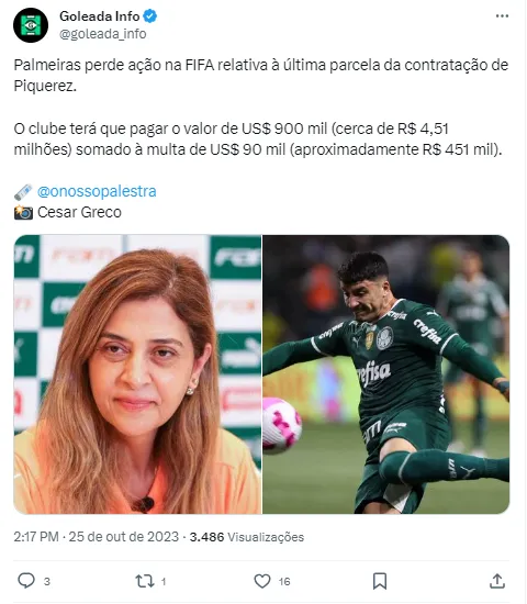 A diretoria do Verdão já sabe há tempos de uma pendência em relação a compra de Joaquín Piquerez, junto ao Peñarol. A reclamação do Clube Uruguaio é que os brasileiros não teriam quitado os valores da negociação, mais precisamente a última parcela. O departamento jurídico do Palmeiras soube que o Aurinegro iria para a Justiça no caso, mas a decisão da FIFA só saiu nas últimas horas.