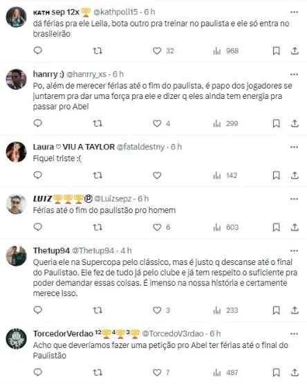 “Uma coisa o torcedor pode ter certeza: eu desejo que o Abel fique por muito tempo no Palmeiras. E vou fazer o possível e o impossível“, completou a presidente palestrina. O técnico, no entanto, deu uma declaração não muito animadora:
