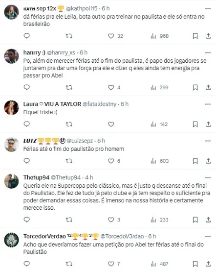 “Vocês sabem que eu tenho contrato. Não posso garantir nada. Quando cheguei ao Palmeiras não podia prometer títulos, apenas uma equipe de qualidade. Eu tenho contrato (até dezembro de 2024) e qualquer coisa que aconteça… Não sei o que vai acontecer. Estou cansado. Preciso de férias. Dia 17, já voltamos a competir. É muito difícil para mim“, finalizou Abel.