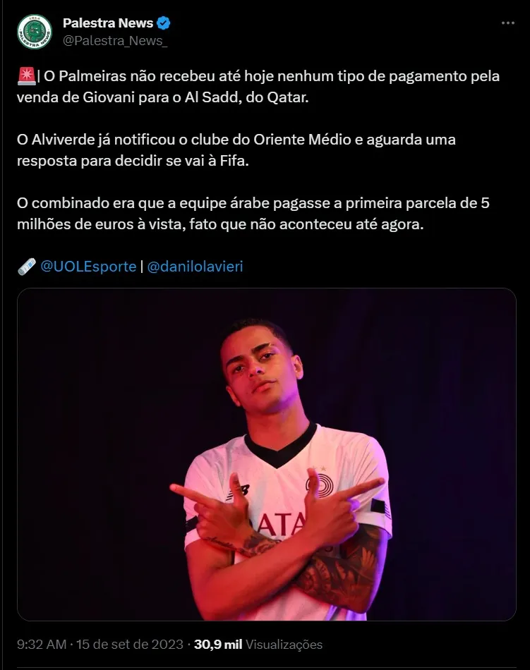 Na vice-liderança do Campeonato Brasileiro e na semifinal da Libertadores, o Palmeiras está evoluindo sob o comando do técnico Abel Ferreira dentro de campo. Mas, o que vem preocupando a diretoria Alviverde é o extracampo. Isso porque, a equipe paulista ainda não recebeu nenhum tipo de pagamento pela venda de Giovani para o Al Sadd, do Qatar.