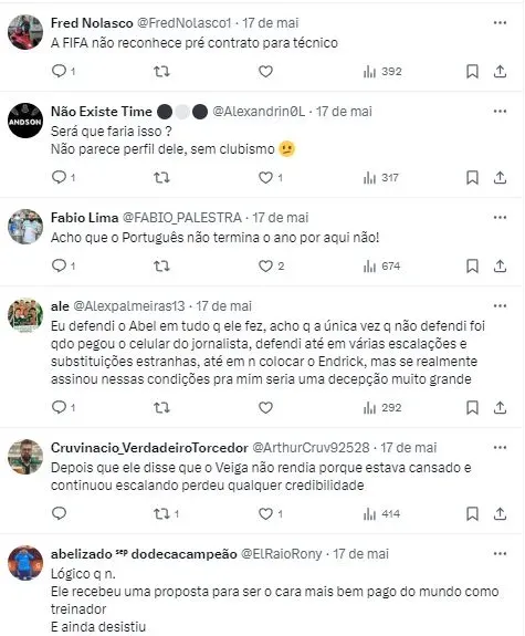 “Ele está preparado para falar. O que se diz desde a semana passada é que o Abel está muito tranquilo com essa situação e tem como grande arma a verdade. O que ele vai dizer hoje é que ele não assinou. O documento que o Al Sadd leva para a FIFA, a Fifa vai avaliar os documentos, mas o Abel vai sustentar que ele não há um pré-contrato, que ele não assinou nenhum acordo que o desvinculasse do Palmeiras”, iniciou PVC.