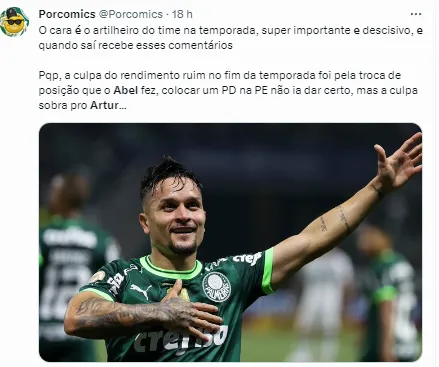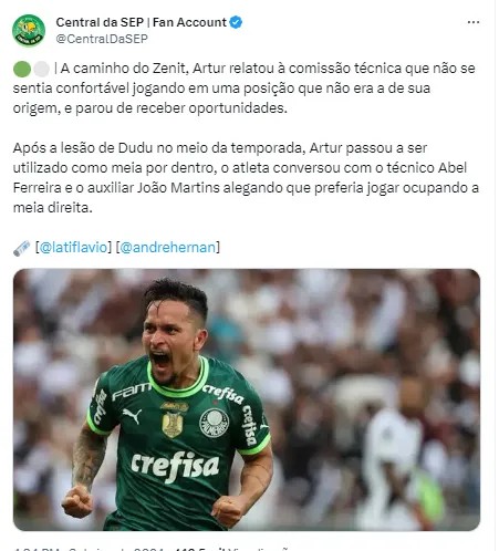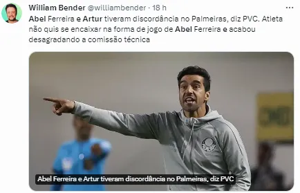 “O Artur não conseguia jogar dessa maneira e foi falar com o João Martins. O João Martins informou para o Abel e ele não gostou dessa conversa. É um bom dinheiro e tem uma situação específica que se criou do Abel não querer mais contar com o Artur, e o Artur não estar se relacionando bem com o Abel por essa questão tática”, completou.