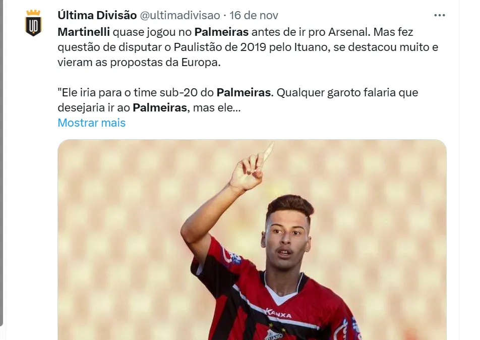Com 18 anos, Martinelli se destacou no Estadual daquela temporada e foi negociado com o Arsenal por R$ 30 milhões. Desde então, foi ganhando espaço nos Gunners. No fim do ano passado, fez parte da Seleção Brasileira na Copa do Mundo do Catar.