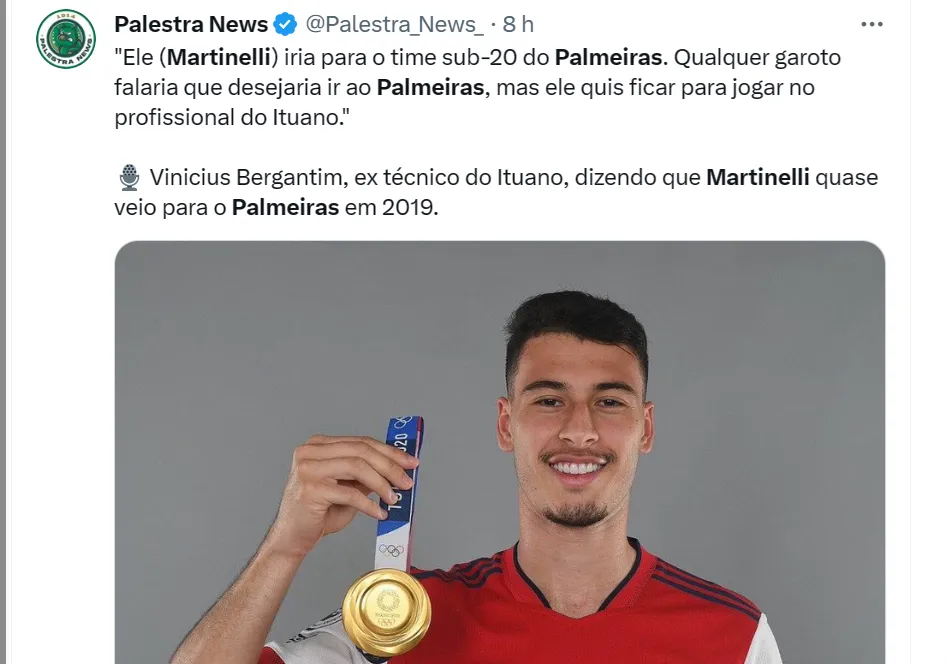 Quem garante a informação é Vinícius Bergantim, ex-técnico do Ituano e que contou com Martinelli em seu time profissional em 2019. Em entrevista à ESPN, ele admitiu que o convite do Palmeiras para jogar no Sub-20 nem balançou o jovem.