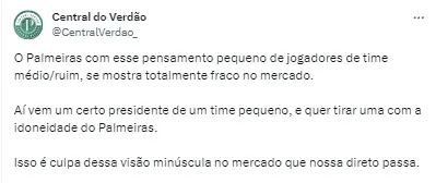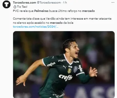 “Mas a direção ainda procura o quarto e último reforço para 2024. Um meia, para a reserva de Raphael Veiga, ou atacante, para os dois lados do campo”, informou PVC.