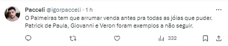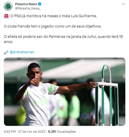 De acordo com o jornalista André Hernan, o meio-campista de 17 anos, mesma faixa etária de Endrick, vem sendo observando pelo Paris Saint-Germain há meses. Com multa rescisória de R$ 290 milhões, o jogador pode encher novamente o cofre do Alviverde.