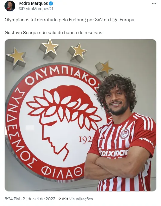 Conforme notado pelo jornalista da Jovem Pan Pedro Marques, o Olympiacos perder nesta quinta-feira (21), na estreia da equipe na UEFA Europa League, e Scarpa nem sequer entrou no jogo. O brasileiro ficou no banco de reservas durante o 3 a 2 para o Freiburg, da Alemanha. A novidade logo virou pauta entre os adeptos do Palmeiras, que não param de pedir o retorno do antigo camisa 14 do Allianz Parque.