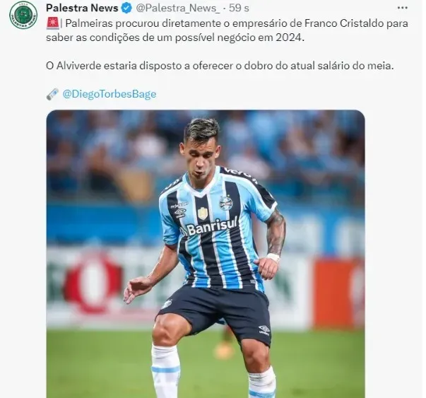 De acordo com o setorista Diego Torbes Bage, o Palmeiras tem interesse na contratação do meia Franco Cristaldo, do Grêmio, para 2024. O jogador é um dos destaques da equipe gaúcha na temporada.
