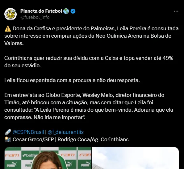 “A Leila (Pereira, presidente do Palmeiras) é mais do que bem-vinda. Adoraria que ela comprasse, adoraria, não iria me importar, não”, disse Wesley Melo, diretor financeiro do Corinthians, em entrevista ao GE.