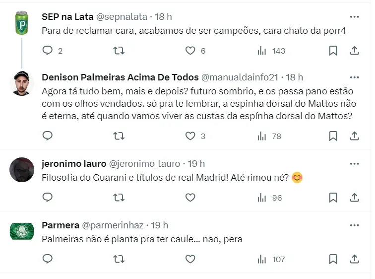 Isso porque, na última janela de transferência, a diretoria não buscou por nenhum reforço. Com o interesse do mundo árabe na contratação de Abel Ferreira, vem gerando desconforto nos bastidores da equipe.