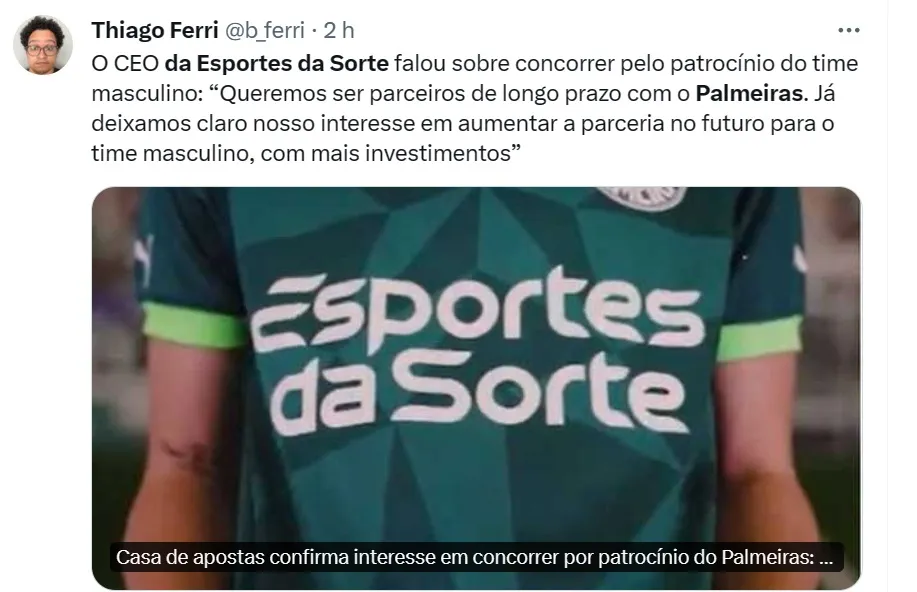 Segundo a coluna de Luís Rosa, do UOL, a Esportes da Sorte já acenou à presidente Leila que fará uma proposta para estampar a sua marca em 2025 na camisa do Palmeiras também no masculino.