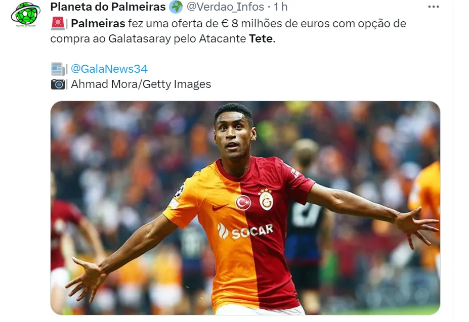 Hoje, Tetê tem contrato na Turquia até junho de 2027 e recebe em torno de R$ 1,2 milhão por mês. O Palmeiras aguarda a resposta dos turcos, mas o Bahia, do grupo City, seria outro interessado no ponta.