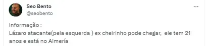 Lázaro surge como essa opção e seria uma contratação interessante, uma vez que ele se destacou muito no Flamengo, mas não se firmou atuando no Almería, da Espanha.