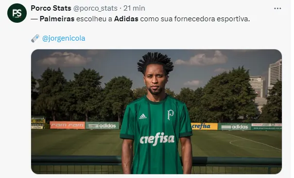 De acordo com Jorge Nicola, o Palmeiras está fechando com a Adidas. O negócio está sendo encaminhado e deve ser fechado em breve.