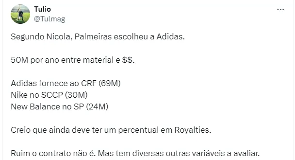 Ainda conforme as informações de Jorge Nicola, o Verdão está fechando um contrato de três anos com a empresa. Com isso, por cada temporada, o time faturaria algo na casa dos R$ 50 milhões por ano.