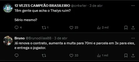 Outro fator importante é que assim como aconteceu com os últimos nomes que se destacam na Academia, ele também tem multa elevada. A multa rescisória de Thalys é de 40 milhões de euros (aproximadamente R$ 220 milhões na conversão da moeda).