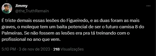 Figueiredo é tratado como uma das principais joias do Palmeiras na base. No entanto, vem sofrendo com lesões e terá que passar por cirurgia após romper o ligamento cruzado do joelho esquerdo.