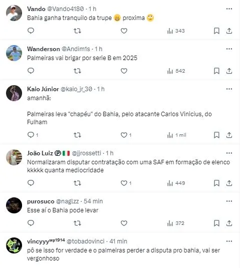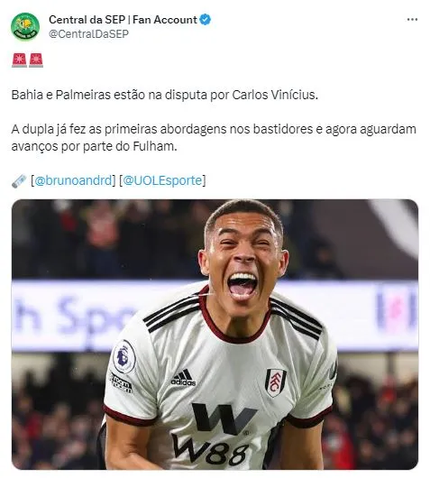 Segundo os jornalistas Bruno Andrade e André Hernan, do Uol Esporte, o Palmeiras entrou em contato para sondar o atacante Carlos Vinicius, atualmente no Fulham, da Inglaterra. Contudo, o Verdão deve encarar a concorrência com o Bahia, controlado pela SAF do Grupo City, que também contactou o staff do atleta.