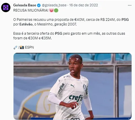 Os franceses, que contam com muito dinheiro, foram os primeiros a formalizar uma proposta para o jogador. Ainda em dezembro de 2022, o PSG sinalizou uma proposta de mais de R$ 200 milhões para garantir ele quando completasse os 18 anos, mas o Verdão rejeitou.