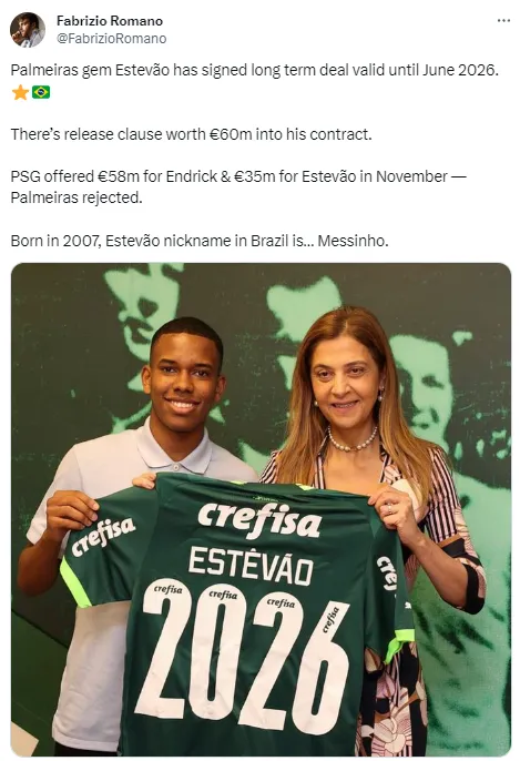O novo nome do momento no Verdão que está sendo disputado pelo mercado é Estevão, que chegou a ser apelidado como Messinho. O jovem de apenas 16 anos já chama atenção de gigantes europeus e inclusive já teve proposta recusada do PSG.