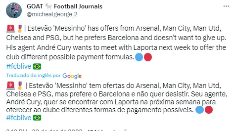 Conforme apuração trazida pelo Uol, Barcelona, Manchester City, Manchester United, Arsenal, Chelsea e PSG são alguns dos gigantes europeus que estariam interessados na contratação de Estevão.