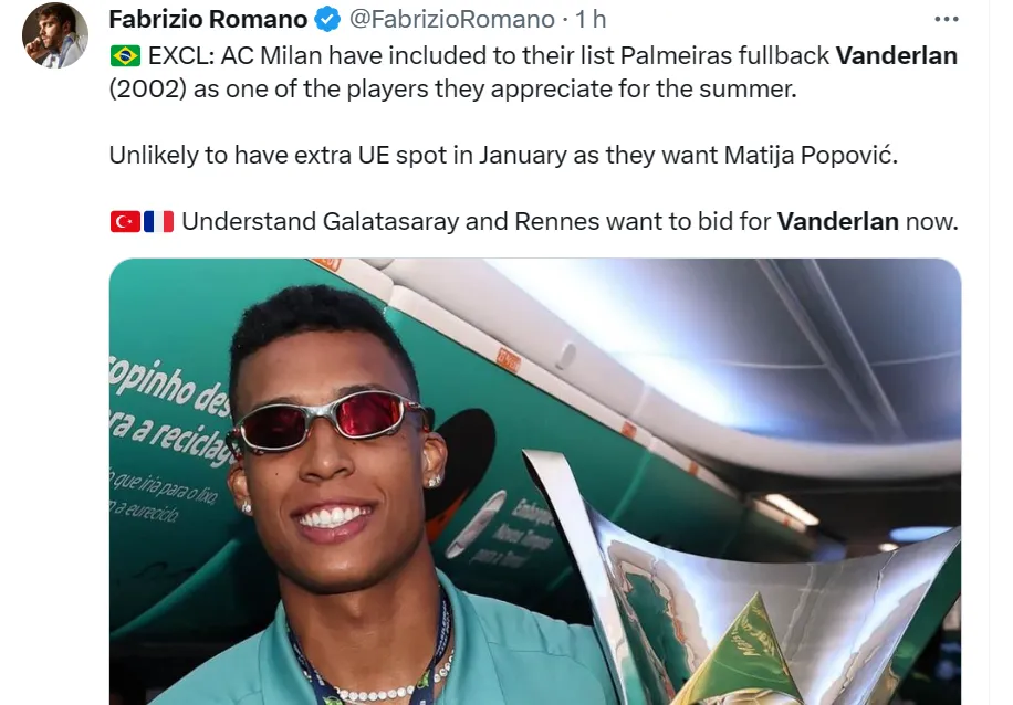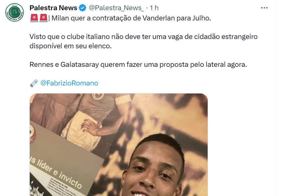 Segundo Fabrizio Romano, o Galatasaray, da Turquia, e o Rennes, da França, desejam Vanderlan para a atual janela e podem formalizar propostas ao Palmeiras nos próximos dias.