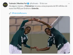 O jornalista expôs uma proposta que já foi recusada por Estevão. “O Palmeiras já recusou uma oferta do PSG de 48 milhões de euros, sendo €25 milhões fixos e €23 milhões em bônus. A Leila afirmou que só vende o Messinho por 65 milhões de euros”.