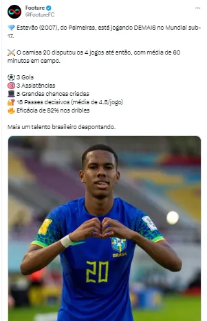 Porém, de acordo com informações do jornalista Jorge Nicola, Endrick pode perder seu posto de maior venda da história do Verdão e isso pode não demorar muito. A nova joia Estevão já vem se destacando no Mundial Sub-17 e pode superar o centroavante.