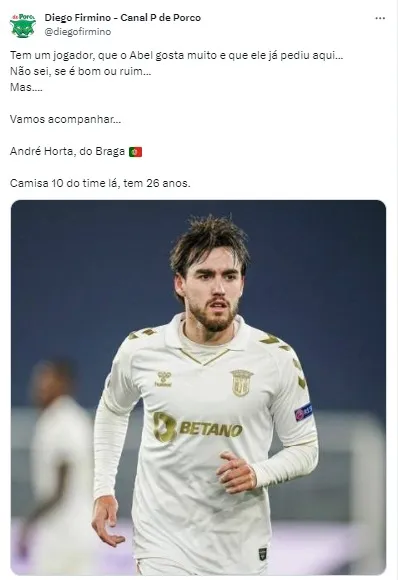 Um nome que agrada bastante Abel Ferreira é do português André Horta, que atualmente está no Braga, de Portugal, e tem 26 anos. De acordo com o portal Transfermarkt, o conterrâneo do comandante palmeirense está avaliado em € 6 milhões e, portanto, teria um preço que a diretoria alviverde está disposta a pagar. O maior problema do armador é que ele é o capitão e um dos jogadores mais importantes da equipe portuguesa.