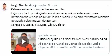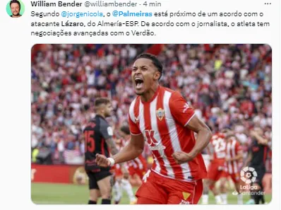 Segundo informações reveladas pelo jornalista Jorge Nicola, uma fonte do comunicador garantiu que já existiria um acerto encaminhado entre o Verdão e o atacante Lázaro, do Almería, da Espanha.