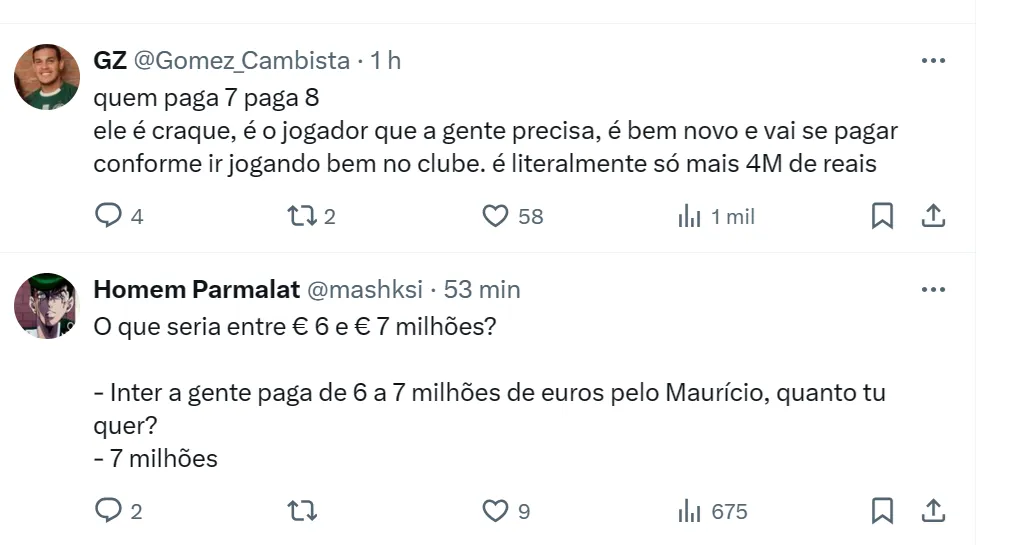 Oficialmente, Palmeiras, Cury e Inter conversam de maneira informal. Mas a presidente Leila acena pagar até R$ 38 milhões, pois Maurício é tratado como sucessor de Raphael Veiga.