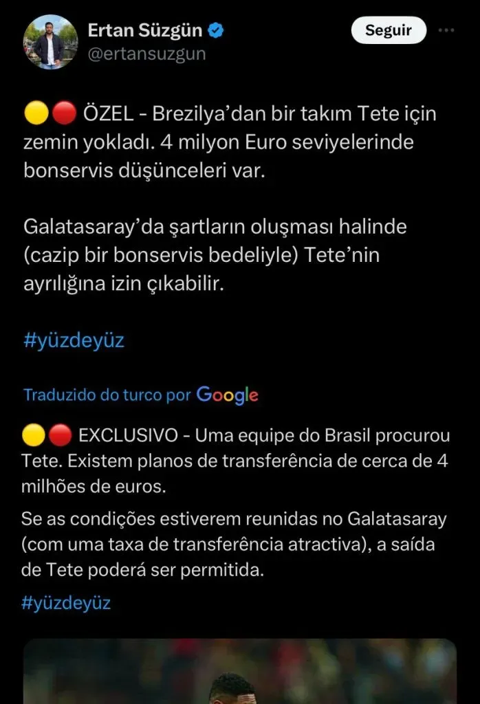 Revelado pelo Grêmio, Tetê atualmente está no Galatasaray, da Turquia. O jogador, nesta sexta-feira (26), teve o seu nome vinculado ao mercado brasileiro de futebol.